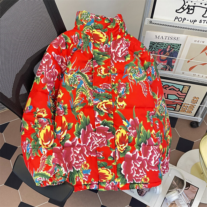 東北の大きい花の上着の国の潮の男性の女性の金の大きい花の綿服のお祝いのカップルの綿入れの上着のゆったりしている厚い冬服のダウンの綿服