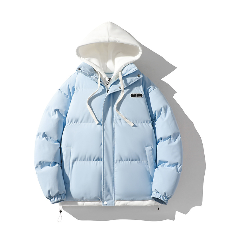 男性の綿服のコートの冬の防寒綿服の帽子付きの偽の2つの2024新型の青少年の綿入れのカップルのファッションカード