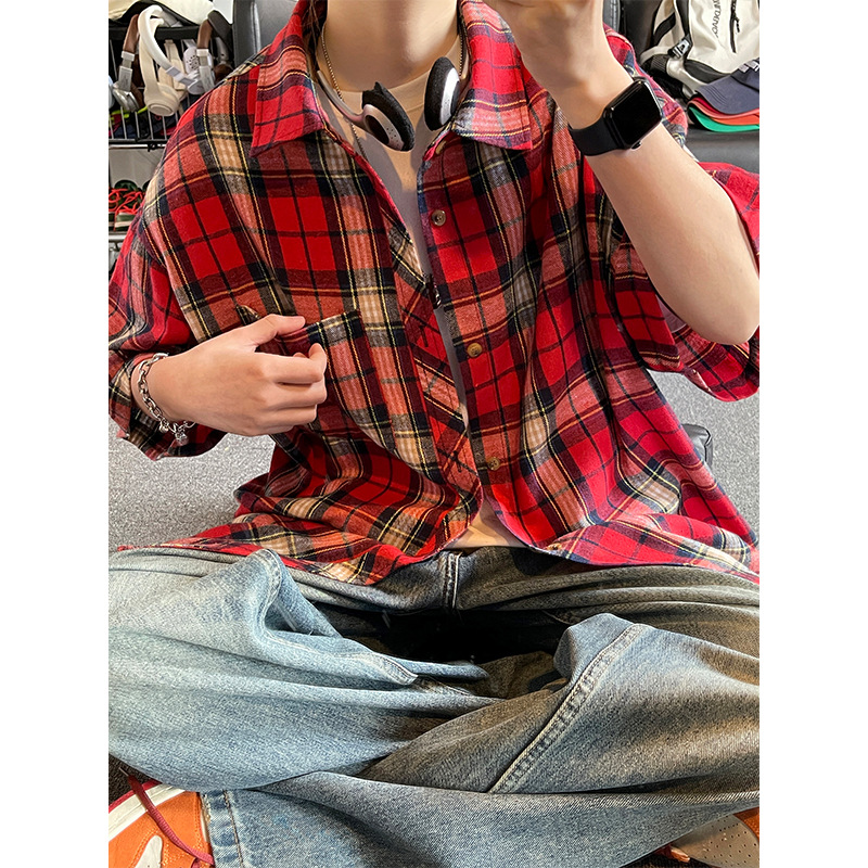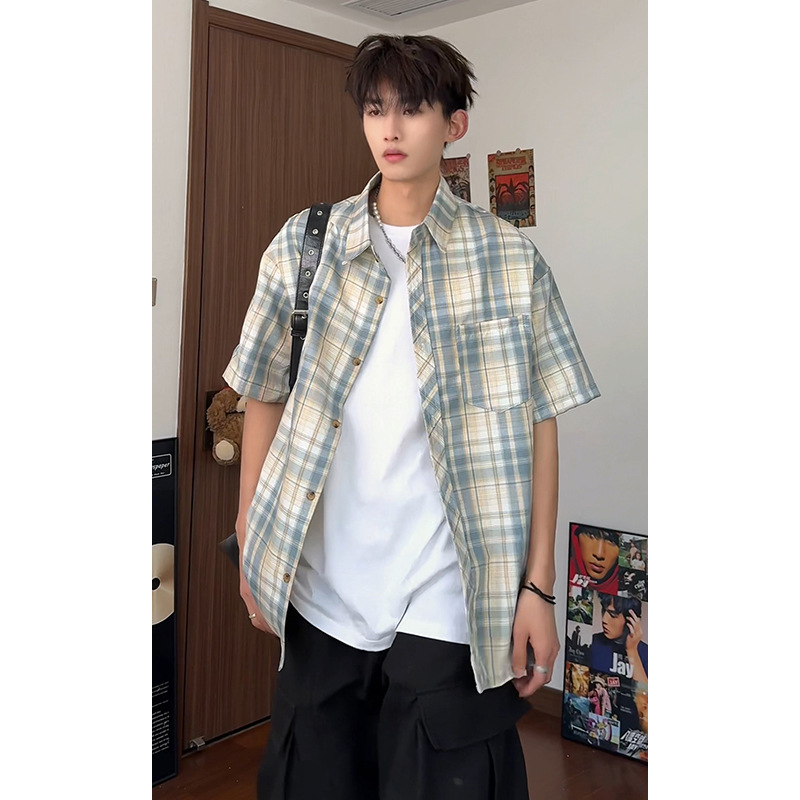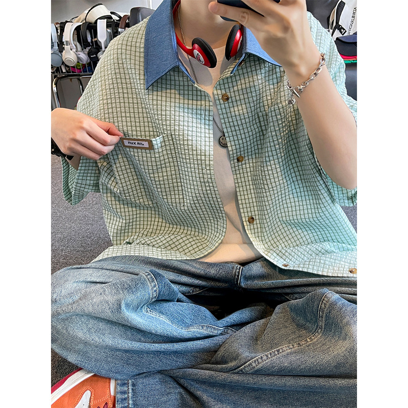 アメリカンレトロチェック柄シャツメンズ半袖夏の新しいトレンディなブランドカラーブロックルーズ大きいサイズカジュアルシャツジャケット男性用