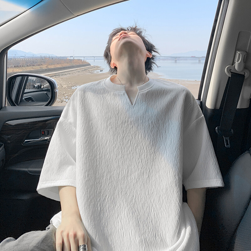 半袖tシャツ男筋理感vネックファッションブランド夏ゆるい五分袖2025新型ネットレッドトレンドinsシンプル