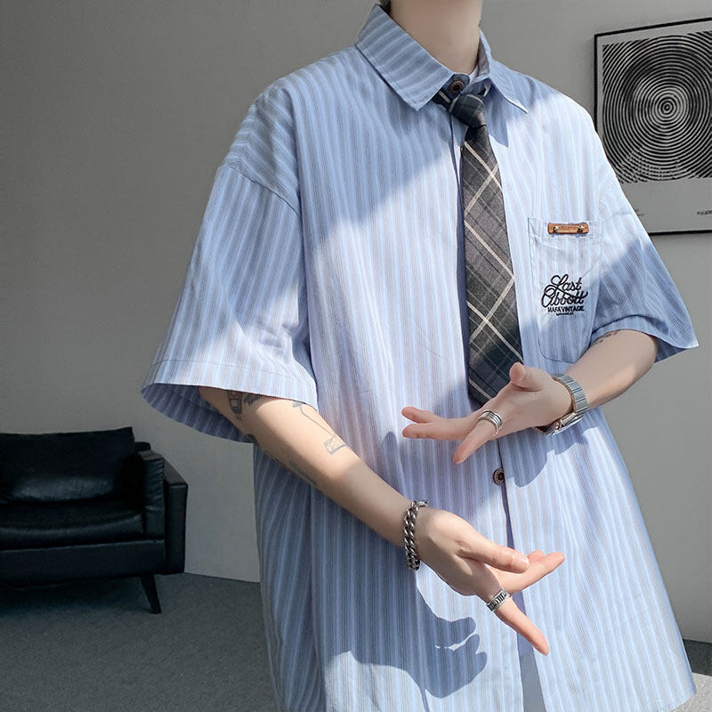 2025 新しい夏のメンズカジュアル半袖シャツアメリカンオールマッチトップ国民風ルーズ香港スタイルストライプシャツ
