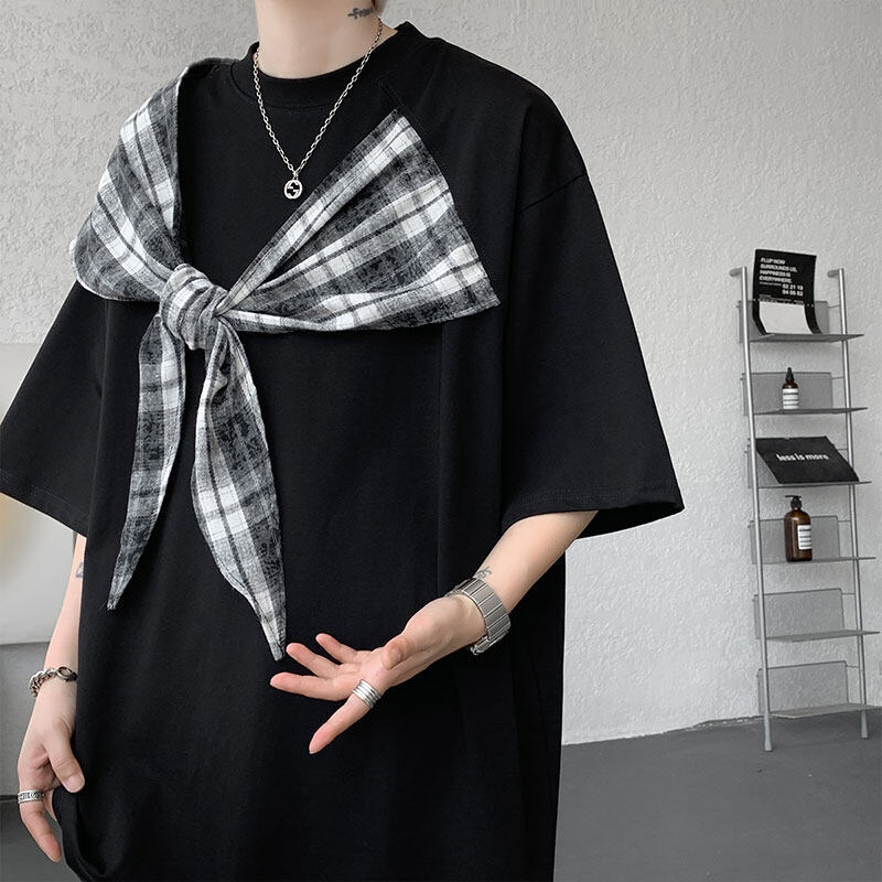 アメリカのレトロな潮牌の蝶結びは布の格子の半袖のtシャツの男性の夏のゆったりしている設計感の小さい大衆の丸い襟の潮を貼ります。