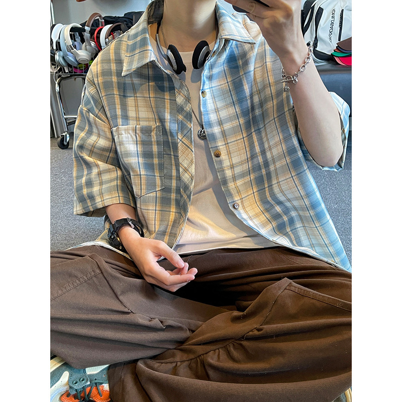 アメリカンレトロラペルチェック柄半袖シャツメンズ2025カップル夏ルーズカジュアルハンサム半袖トップ