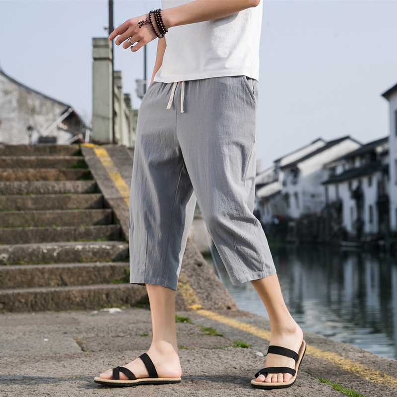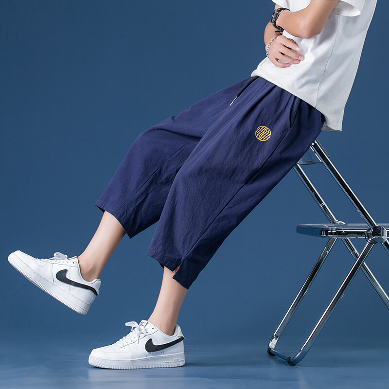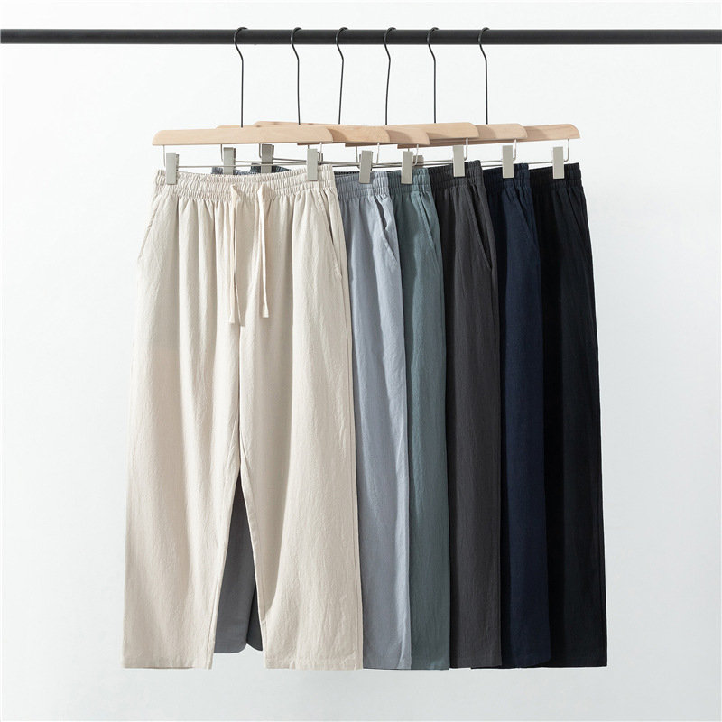 綿麻七分ズボン男性夏新型男性式ゆるいレトロ純色運動カジュアルパンツ大サイズ中国風ズボン