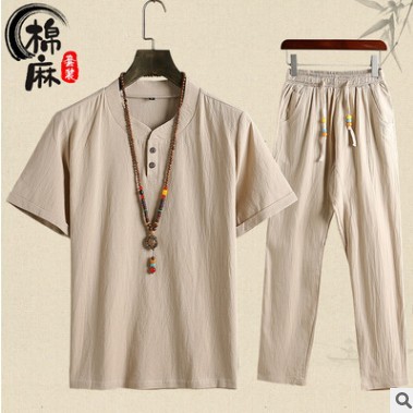 夏中国風リネン紳士服中高年お父さん半袖Tシャツ夏服高齢おじいちゃん綿麻カジュアルスーツ