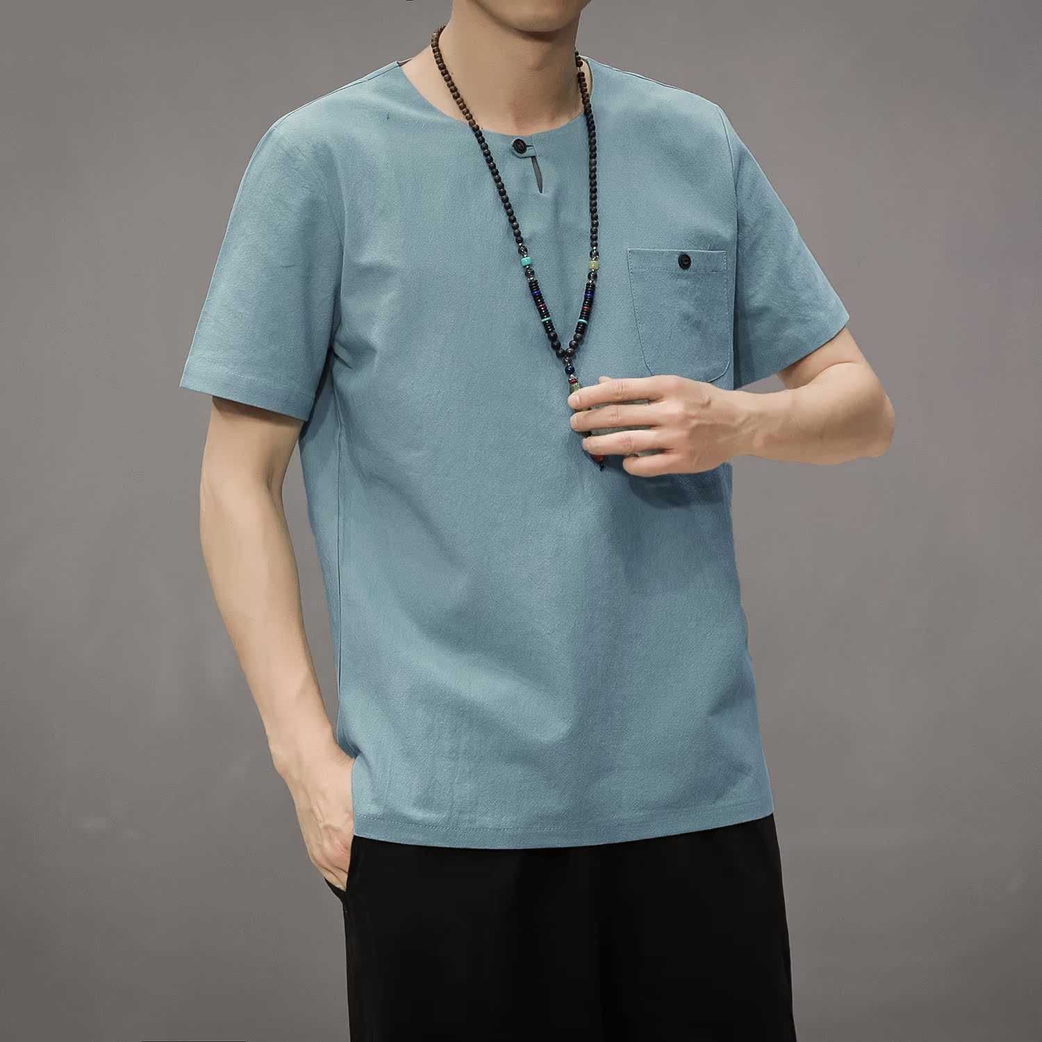 綿麻半袖tシャツ男性夏ゆるい半袖大サイズ亜麻tシャツ純色通気丸襟薄い上着