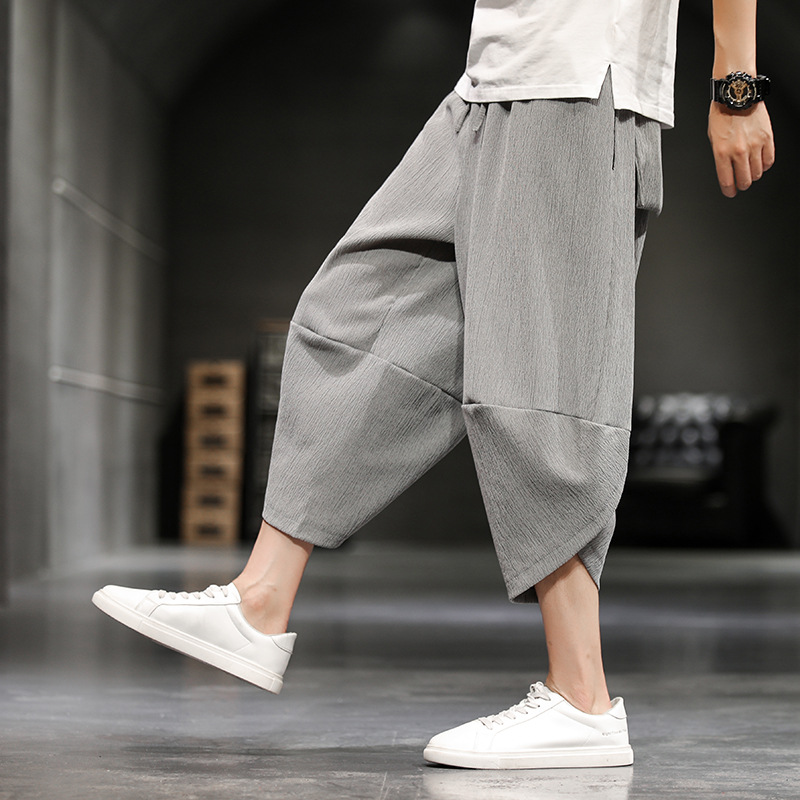 男性用クロップドパンツ、夏用薄手ルーズパンツ、アイスシルクカジュアルパンツ、中国風レトロブルマー、7点キャロットパンツ