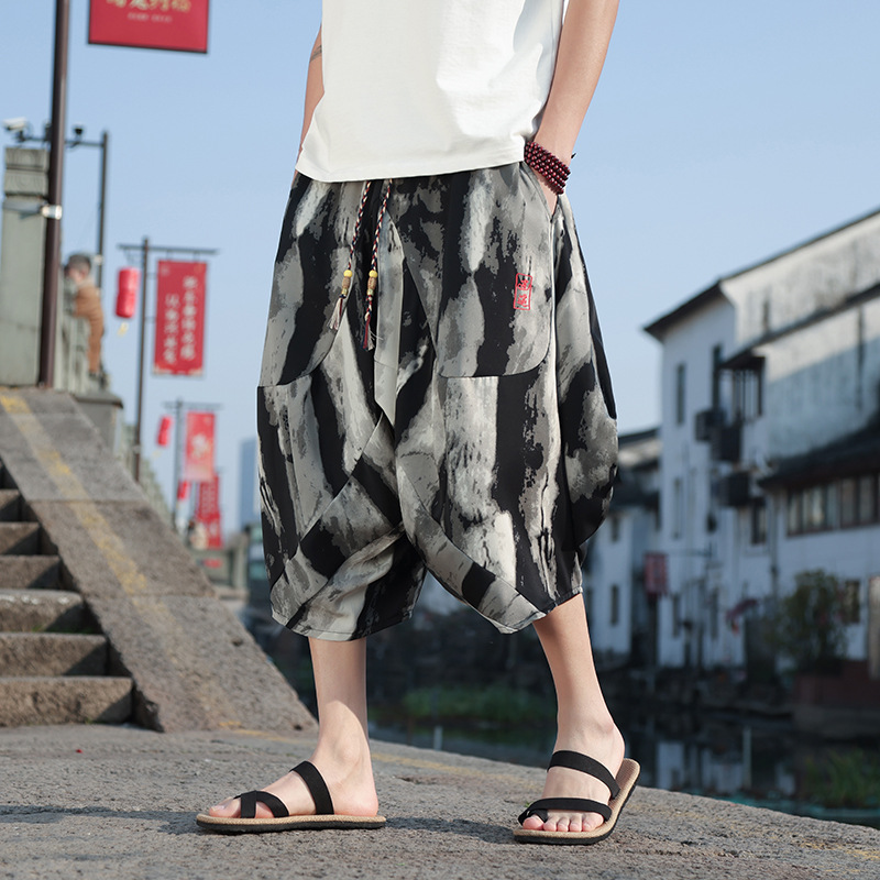中国風インク絞り染めアイスシルククロップドショーツメンズ夏ハイエンドトレンディブランドルーズハーレムパンツカジュアルパンツ
