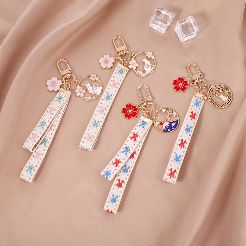 新商品の甘い刺繍のリボンの合金のキーホルダーのペンダントの創意の花輪の玉のウサギの小さい花は包みを飾って飾ります。