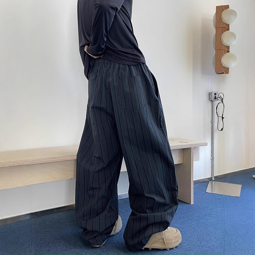 アメリカンレトロな黒と青の縦縞スナイパーワイドレッグパンツメンズルーズカジュアルレイジーフロアレングスパンツ男性と女性のための春と秋