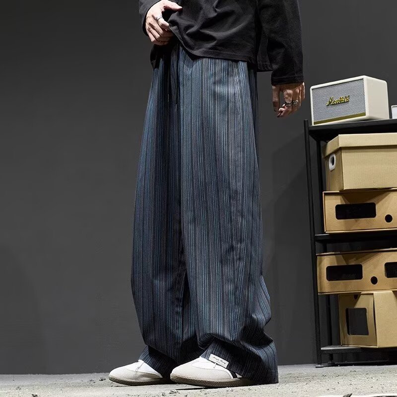 2025 春と秋の新レトロ縦ストライプシミターカジュアルパンツ男性用、レギンスとフロアレングスのワイドレッグロングパンツ
