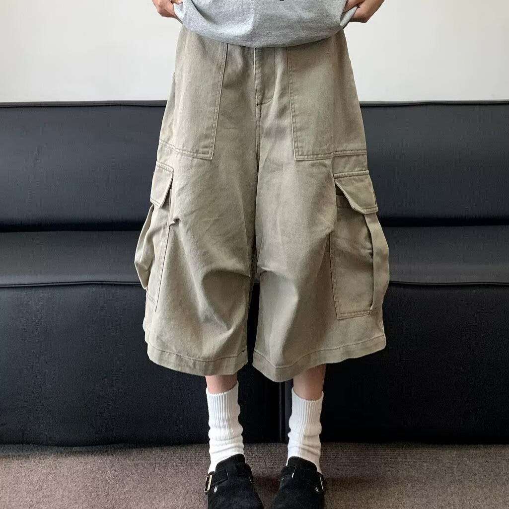 アメリカンレトロ無地ワイドレッグクロップドパンツマルチポケットデザインオーバーオールウォッシュショーツ男性と女性のトレンディパンツ