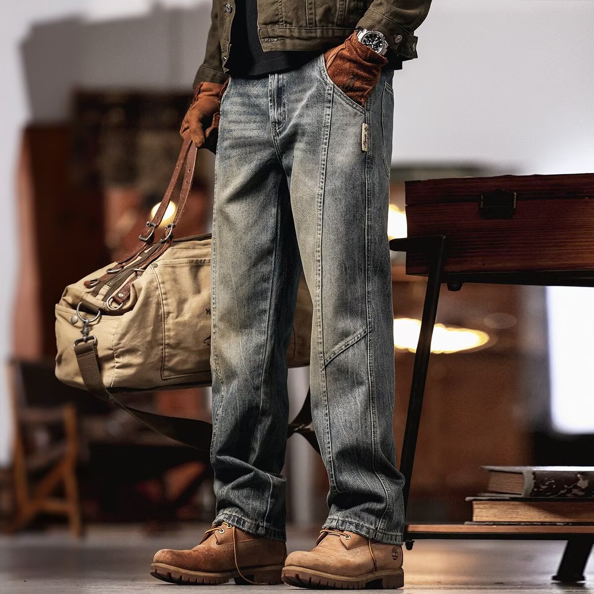 2025 新しいトレンディなブランドステッチハイエンドレトロジーンズメンズルーズストレートカジュアルパンツメンズ秋パンツ