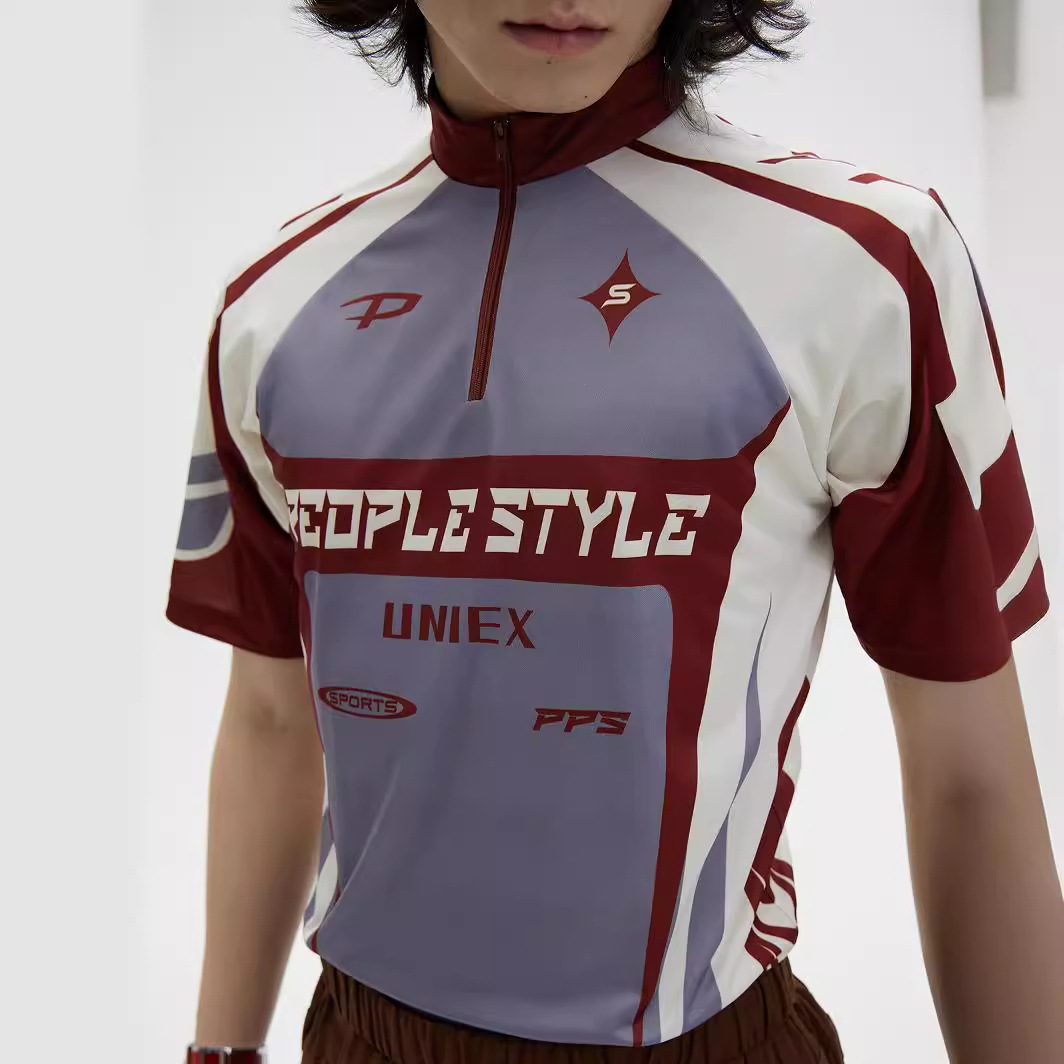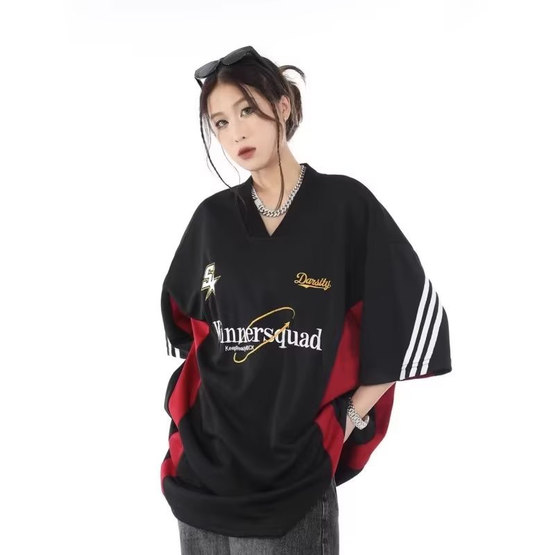 夏のストリートアメリカンレトロスプライシングVネックスポーツ半袖Tシャツ男性と女性のためのニッチトレンディなレーシングスーツ半袖トップ