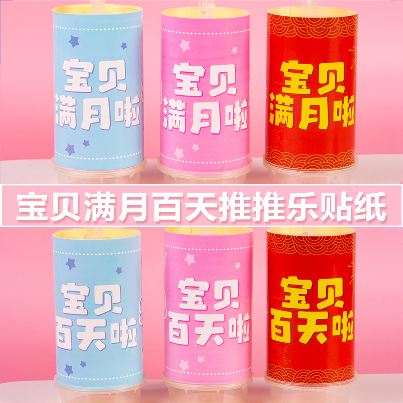 赤ちゃんの満月の百日の誕生日の宴会のデザート台はピンクの青い系の子供の舞の獅子を飾って楽筒の貼り紙を押します。