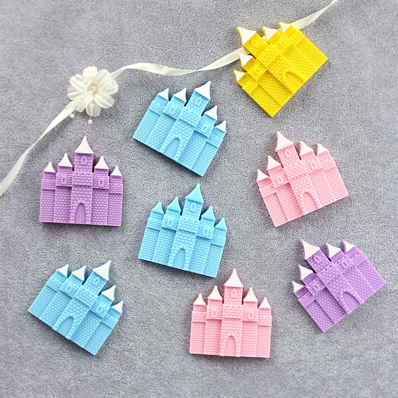 城のケーキは男の子の女の子のピンクの青いテーマの子供の誕生日のケーキを並べてプラスチックの城を飾ります。