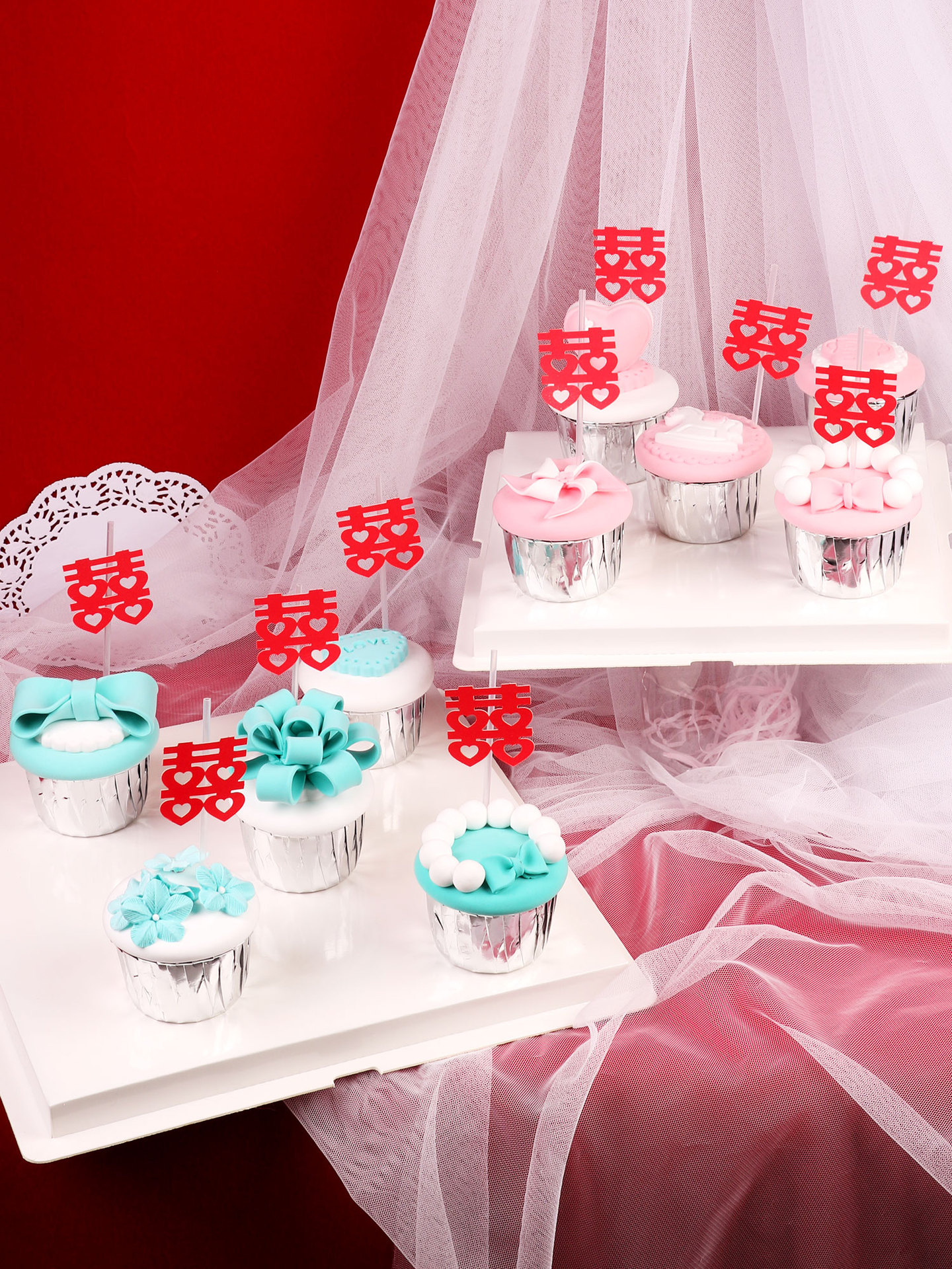 ケーキの装飾結婚婚約双喜ケーキは結婚式パーティーのデザート台に誕生日ケーキのプラグインを配置します。