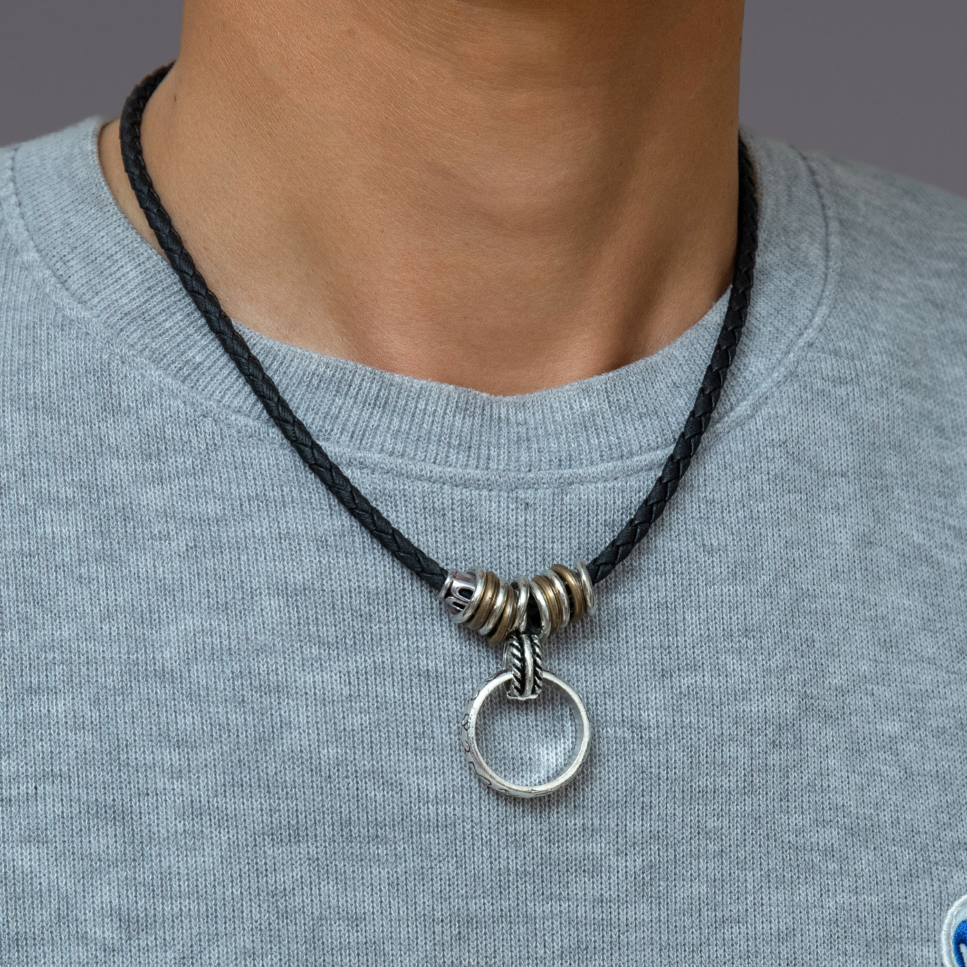 ファッション復古風合金模造古銀彫刻円環ペンダント革編み男性ネックレスは通勤休暇に適している