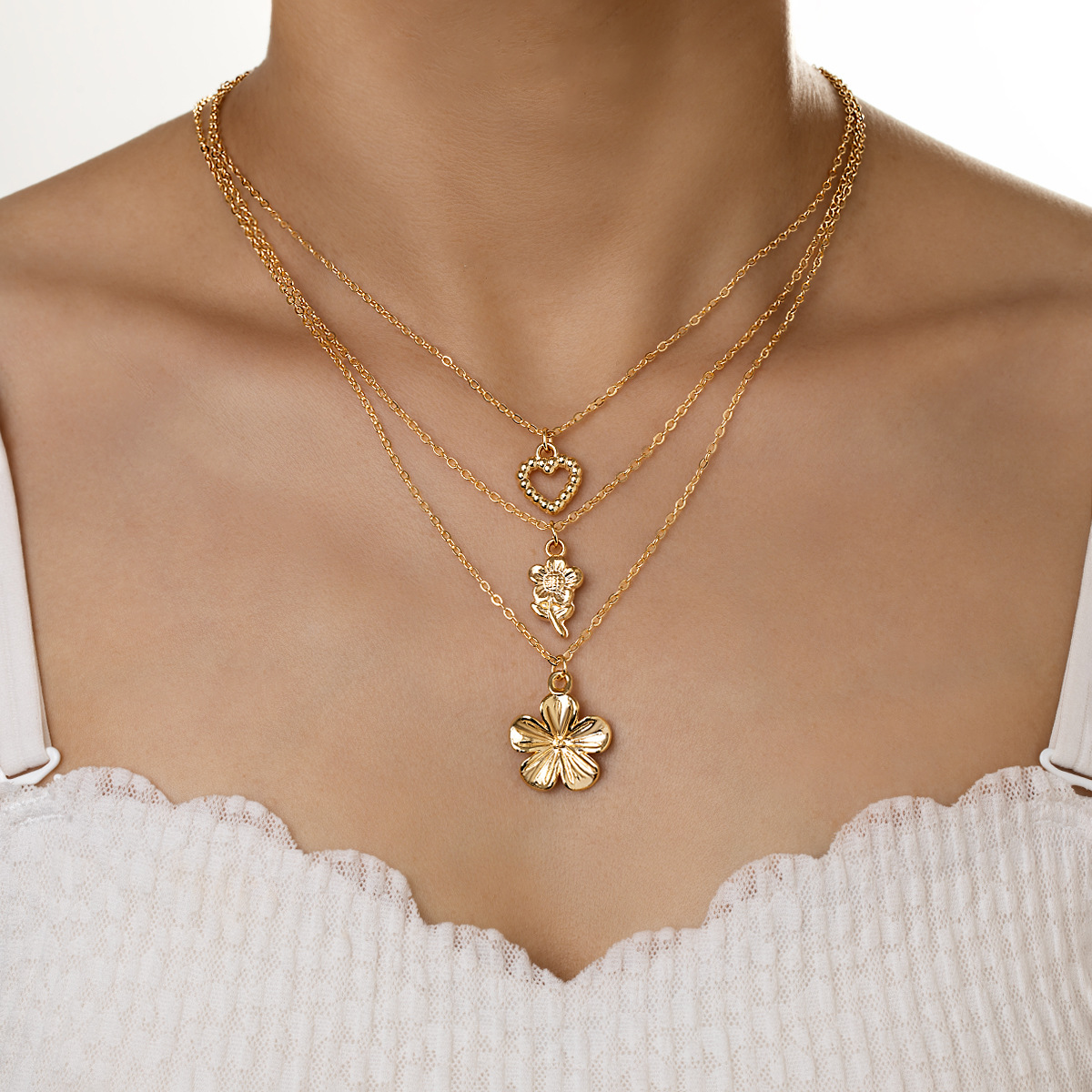 ヨーロッパとアメリカのファッショナブルなパーソナライズされた積み重ねスタイルのラブフラワーペンダント細いチェーン調節可能なレディースネックレス3点セット