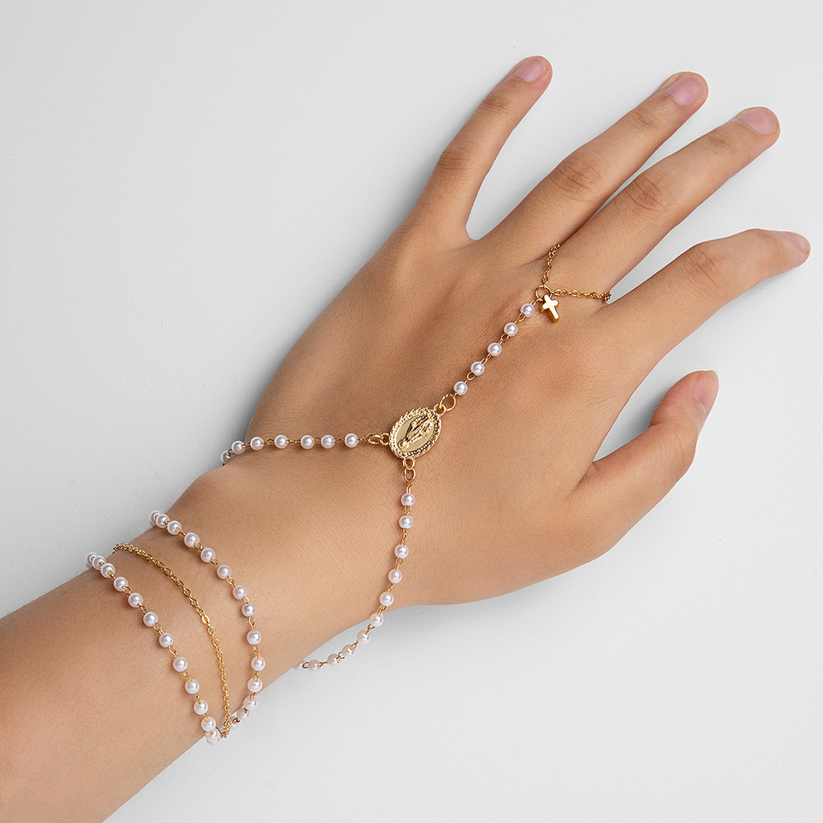 ファッショナブルでパーソナライズされたシンプルで多用途なクロスメダル模造パールビーズ多層調節可能なレディースブレスレット