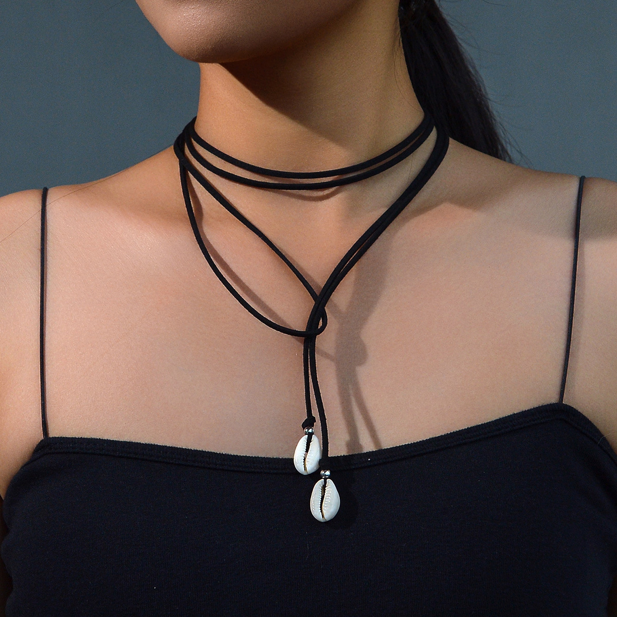 ファッションリゾート風ランダム天然貝殻ペンダント黒ベルベットロングタイプの女性ネックレス