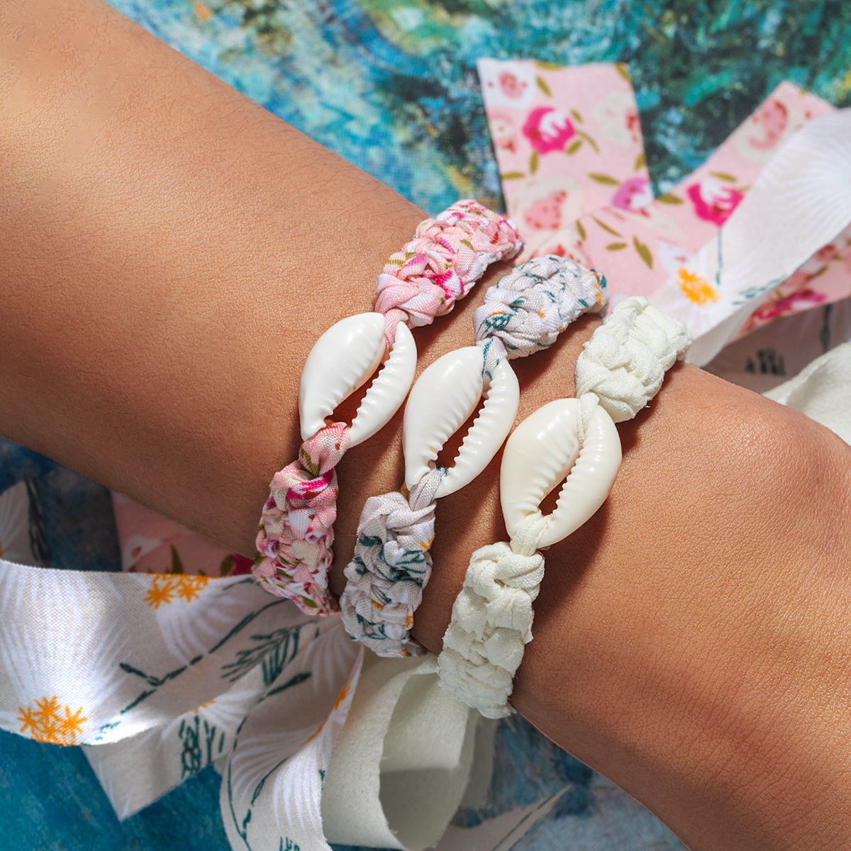 国境を越えたボヘミアン風天然貝殻麻花布芸編みレディースブレスレット三点セットはビーチ休暇に適しています。
