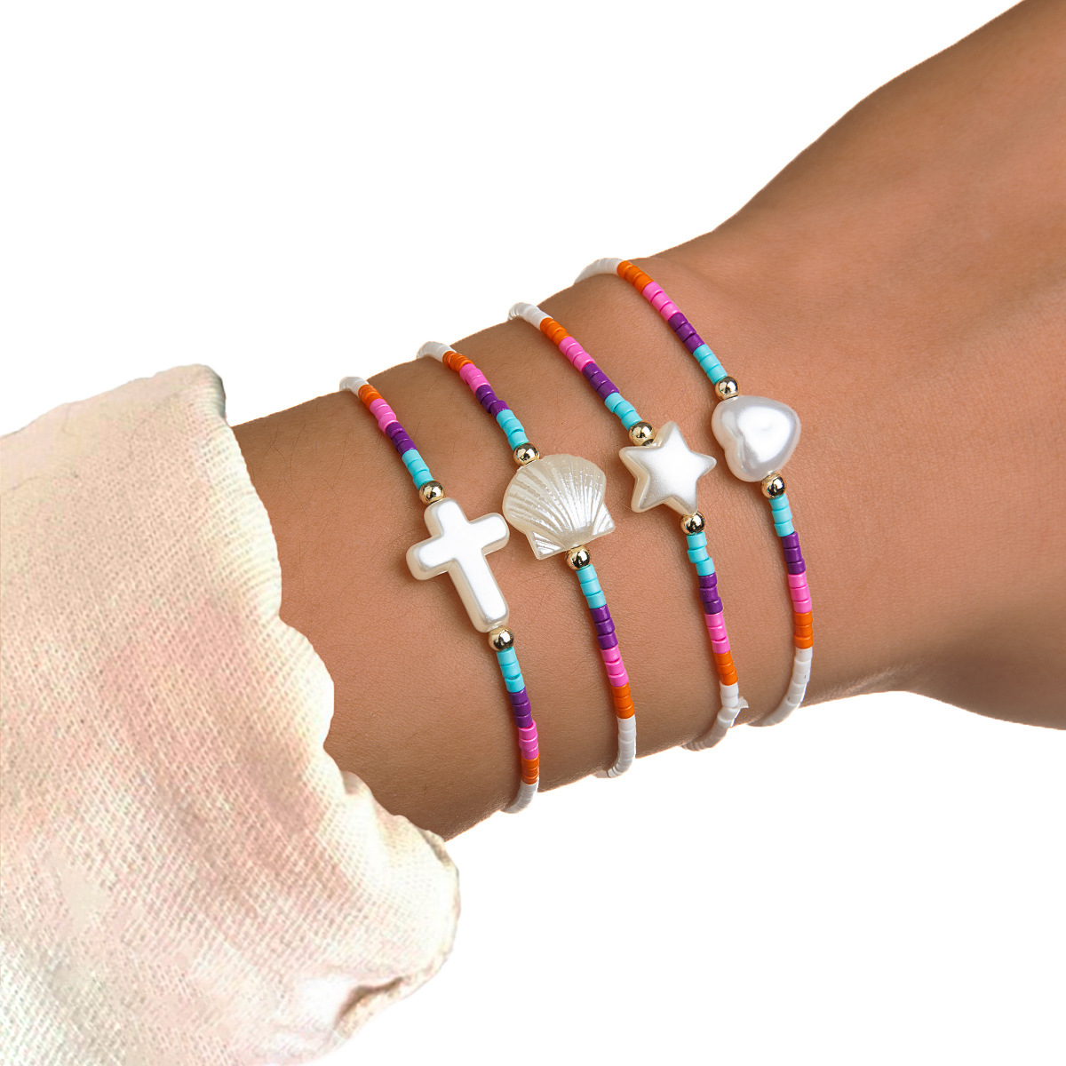 越境ファッション個性風樹脂桃心星貝殻クロス編みストレッチ式レディースブレスレット4点セット