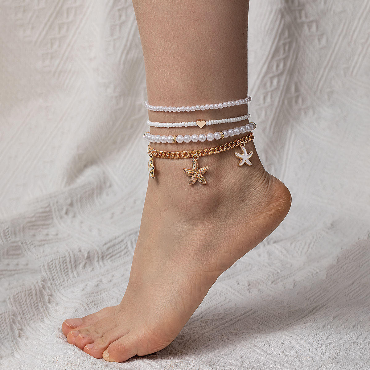 夏の新ファッションオーシャンスタイル合金ヒトデペンダント愛白ライスビーズ模造真珠多層女性のアンクレット