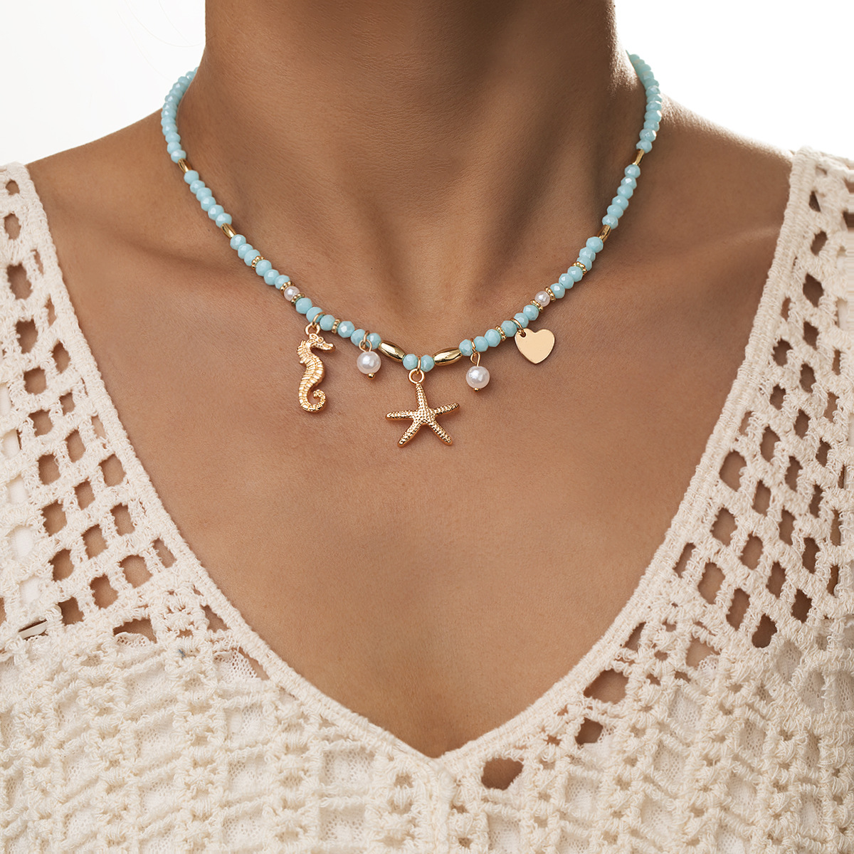 ボヘミアンリゾートスタイル合金タツノオトシゴ愛模造真珠ペンダントグリーンクリスタルビーズレディースネックレス