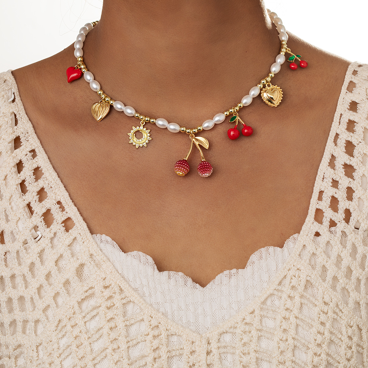 ヨーロッパとアメリカの国境を越えた新しいファッションクリエイティブかわいいチェリーラブサンペンダント模造真珠ビーズレディースネックレス