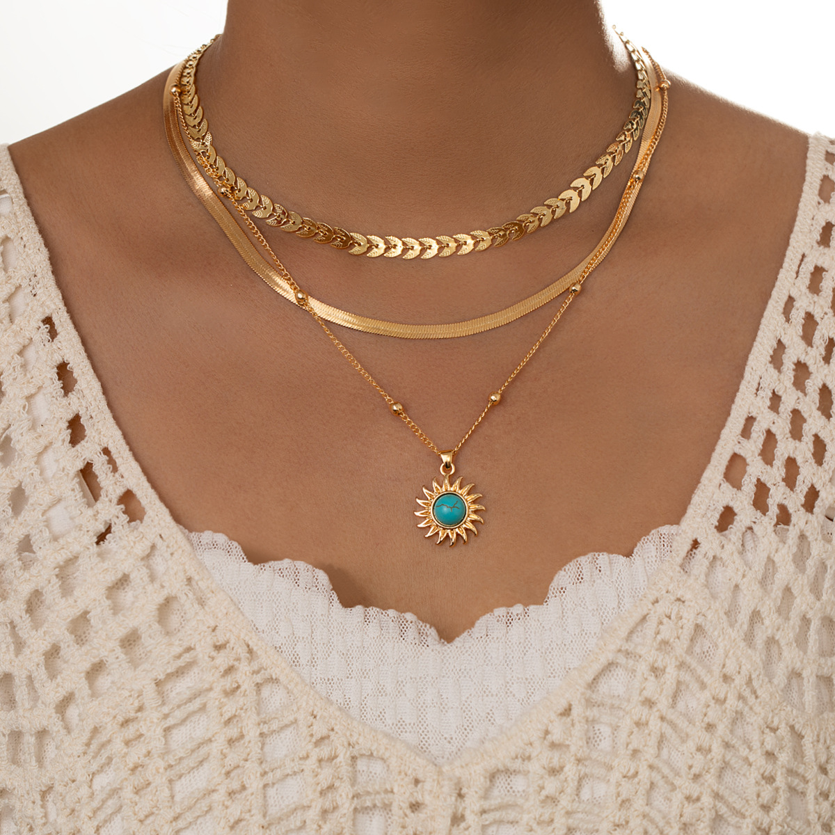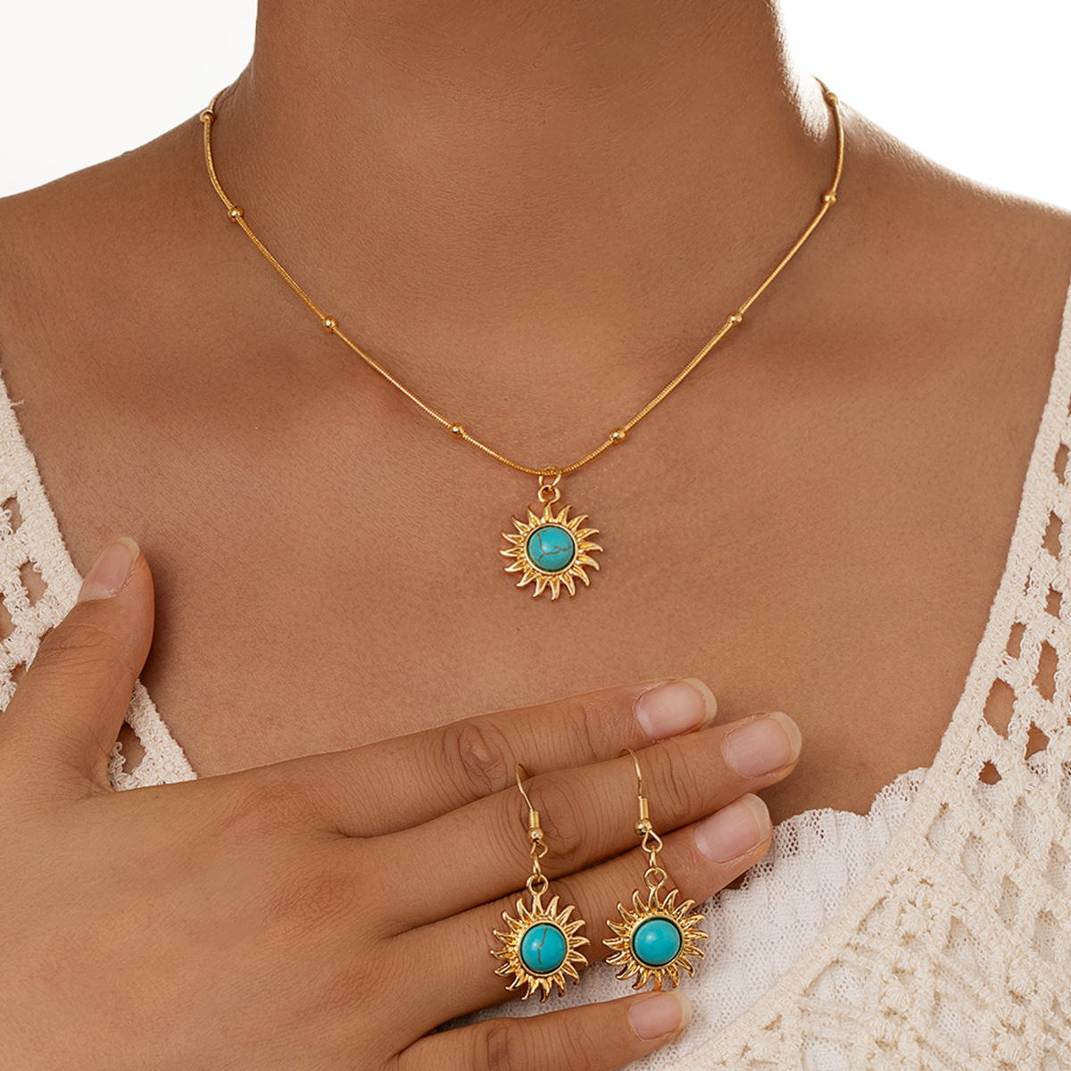 Amazon クロスボーダートレンドホットセールジュエリーセットレトロ模造ターコイズ合金太陽ペンダントネックレスイヤリングセット