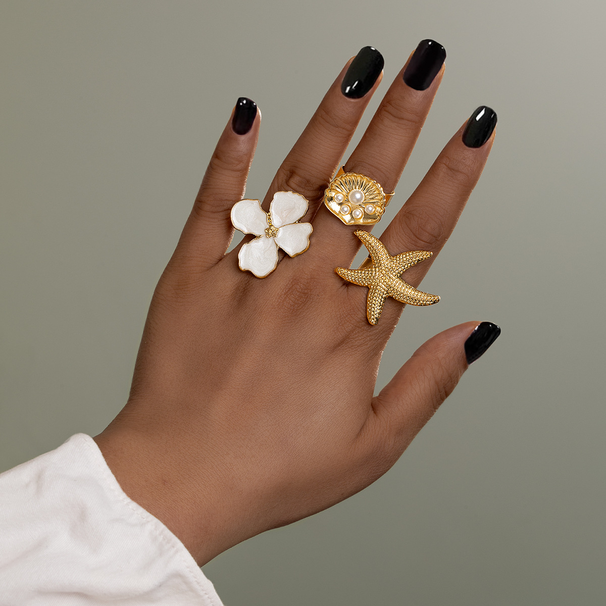 ボヘミアンビーチスタイル合金ヒトデドリップオイルフラワーシェルABSパール調節可能なマルチピースリングセット女性用
