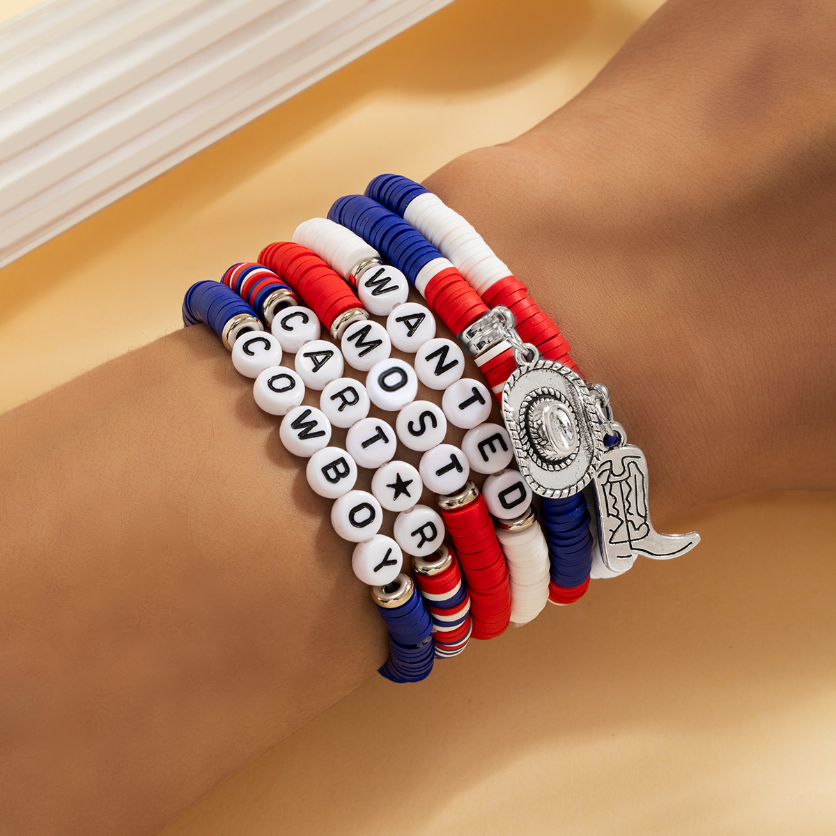 ヨーロッパとアメリカのレトロなスタイルの合金帽子ブーツペンダント文字青白赤ソフトクレイビーズマルチピースセットウエスタンブレスレット女性用