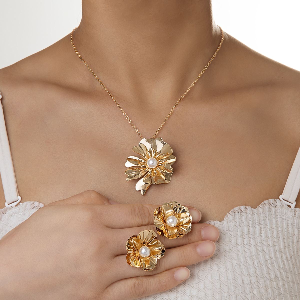 クロスボーダーファッショントレンドネックレスイヤリングセット装飾品 ABS パールメタルフラワーレディースネックレスイヤリングセット