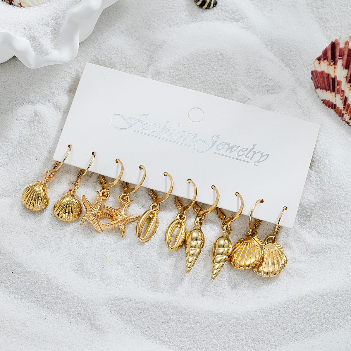 クロスボーダーファッションオーシャンスタイル法螺貝ヒトデ貝殻ペンダント銅耳バックルカードマルチピースレディースイヤリング