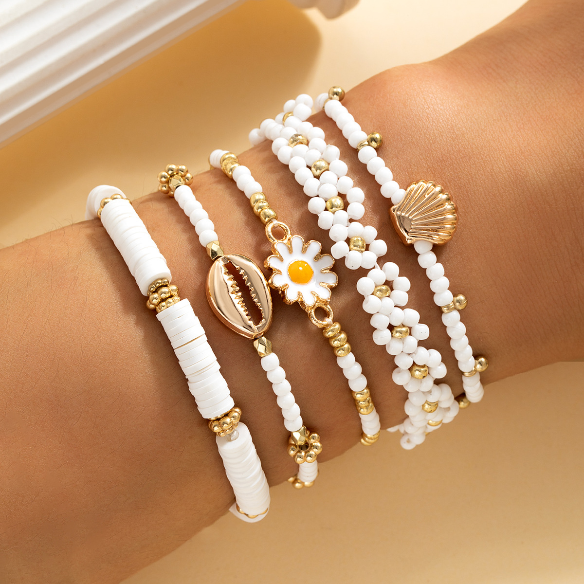 ボヘミアンリゾートスタイル合金シェルホタテライスビーズCCBソフトクレイビーズ弾性レディースブレスレット5点セット