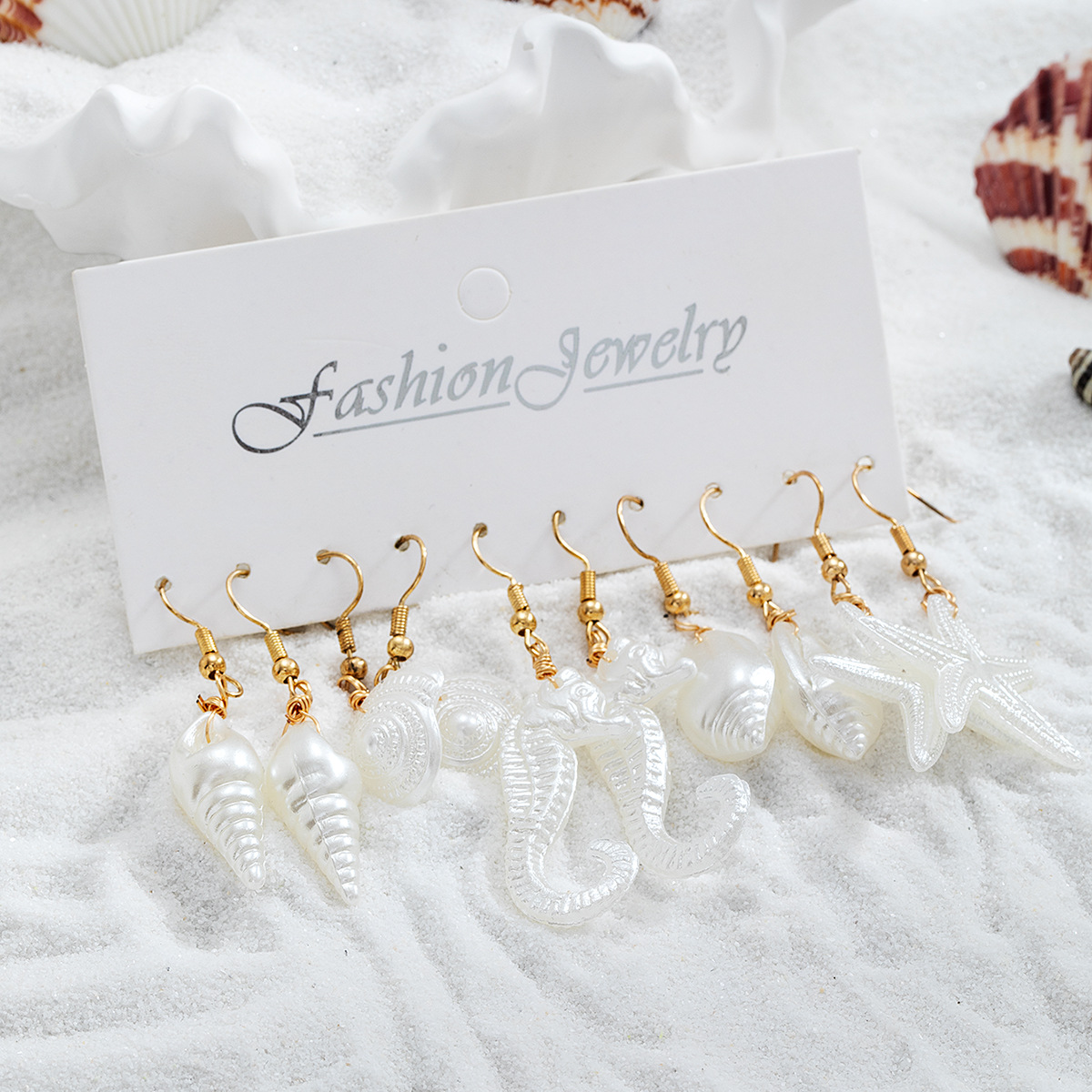 クロスボーダーファッションオーシャンスタイルパーソナライズされたシンプルな巻貝タツノオトシゴヒトデペンダントレディースカードマルチピースイヤリング