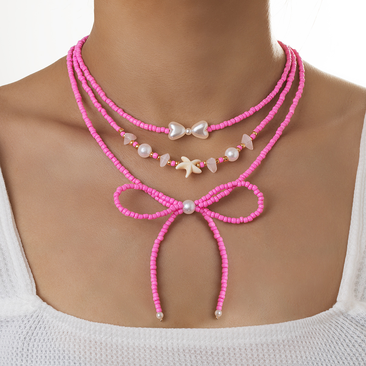ヨーロッパとアメリカの甘くてかわいい ABS パールターコイズヒトデラブライスビーズリボンビーズ多層レディースネックレス