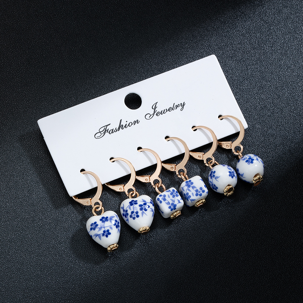 中国風レトロ青花セラミックハート型正方形ラウンドペンダントレディースイヤリングカードセット耳飾り