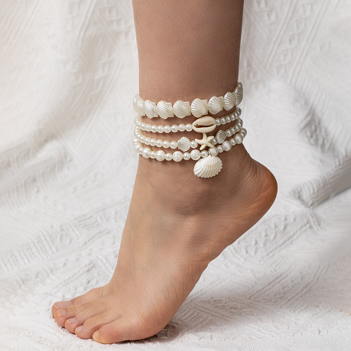 ファッショナブルなビーチリゾートスタイルのシェルペンダントターコイズヒトデ模造パールビーズ弾性レディースアンクレット4点セット