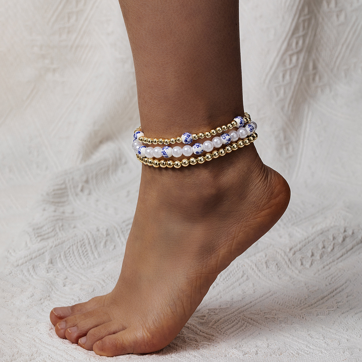 中国風の新しい CCB 青と白のセラミックビーズ模造真珠ビーズ弾性レディースアンクレット 3 点セット新しい中国風のジュエリー
