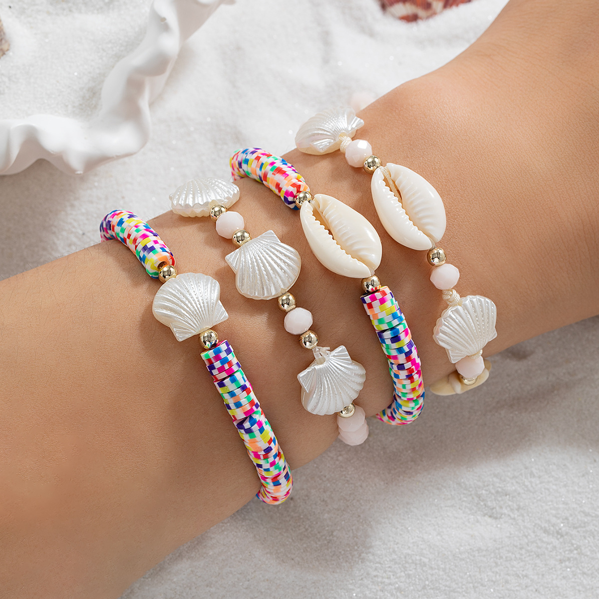 越境ファッションビーチリゾート風天然貝殻ホタテ水晶カラーソフト陶弾力女性ブレスレット四点セット