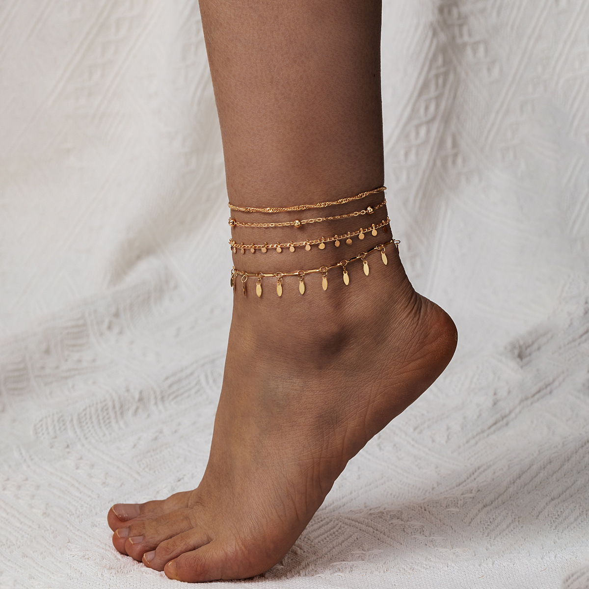 スタイリッシュなパーソナライズされた積み重ね可能な楕円形のディスクタッセルペンダントメタルチェーン調節可能な多層レディースアンクレット