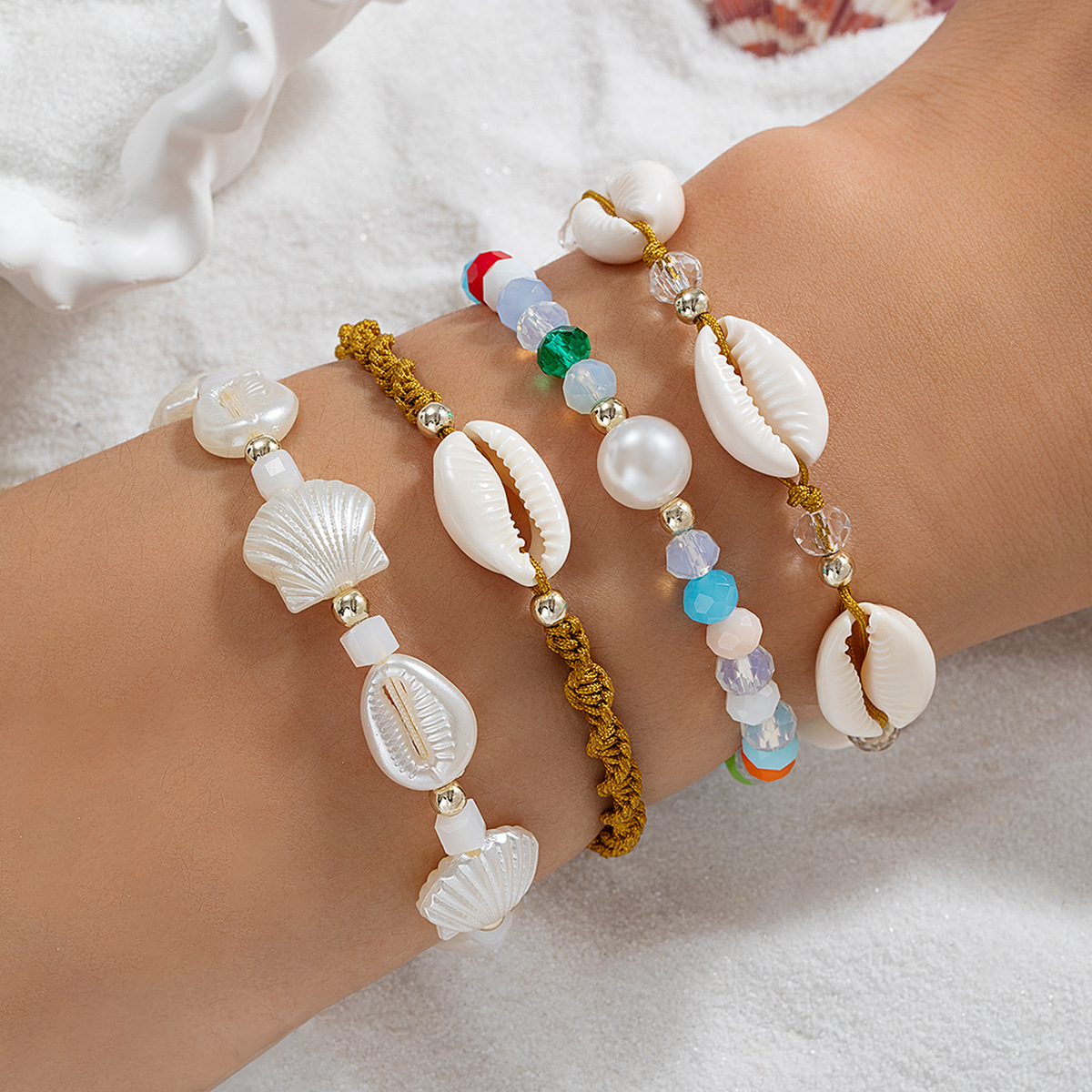 ボヘミアンスタイルクリスタルABSパール天然シェル編組多層調節可能なレディースブレスレット4点セット