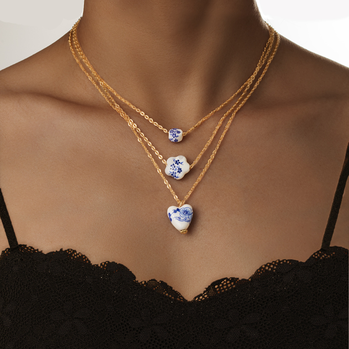 中国風青と白のセラミックラウンドラブ五芒星セラミックペンダント細いチェーン調節可能なネックレス 3 個セット