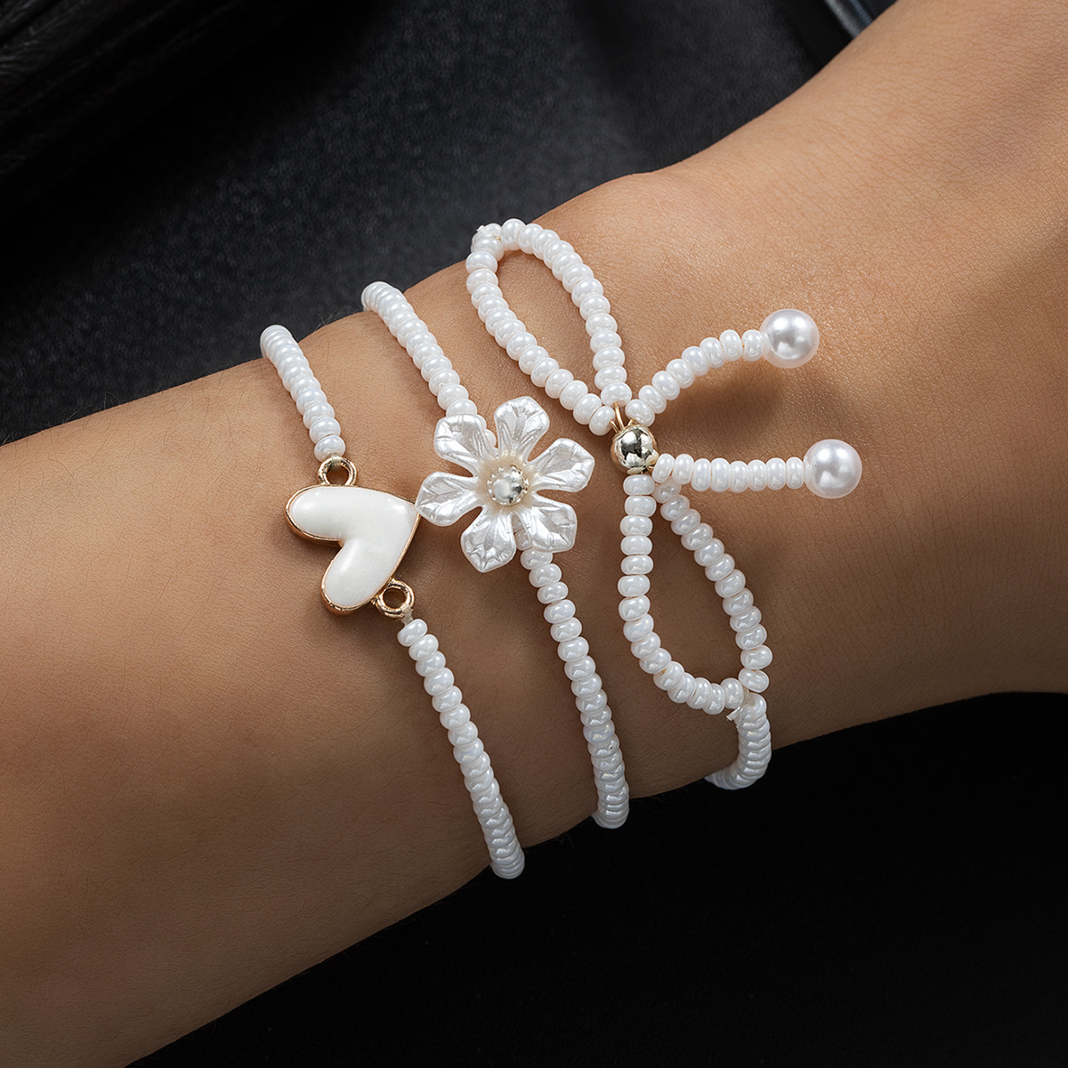 ファッションクリエイティブスイートホワイトライスビーズ模造真珠織り弓花合金愛弾性レディースブレスレット