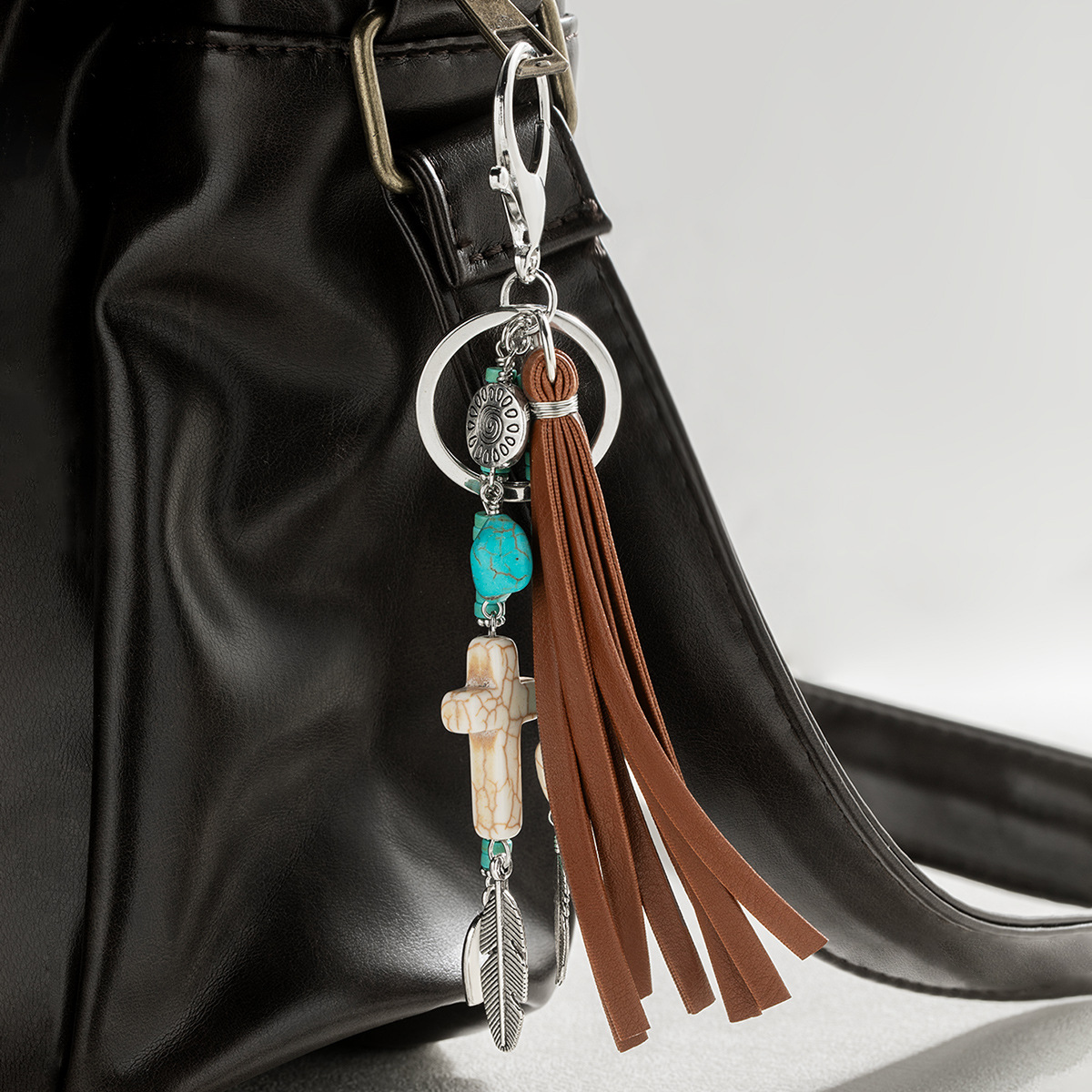 レトロな民族風の合金の馬蹄の鉄の羽の松石のクロスの皮の縄のフリンジペンダントのキーホルダーのバッグのペンダント