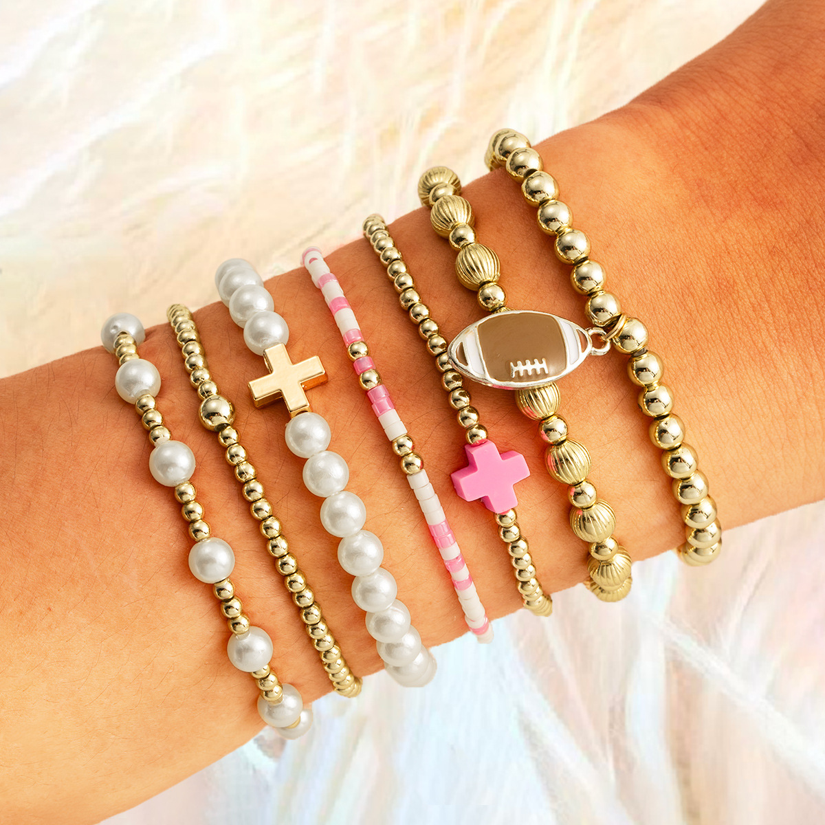 ファッションシンプル個性風合金ラグビークロスCCBビーズ編みストレッチ式レディースブレスレット7点セット