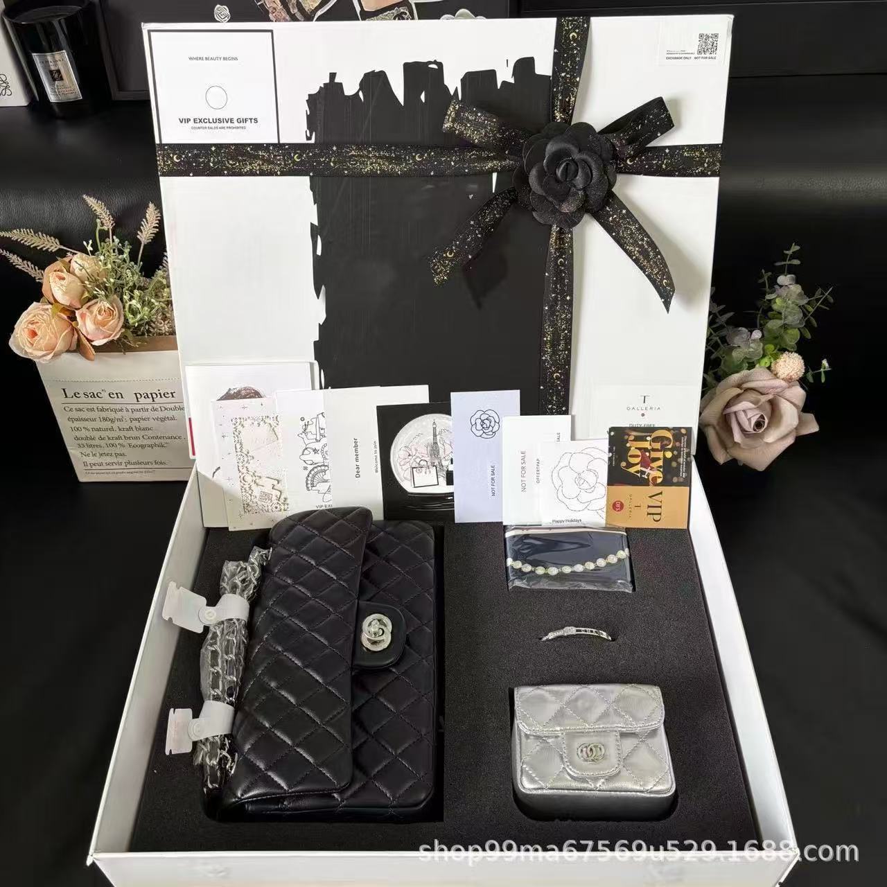 越境会員ギフトVIPギフト4点セット ブラックシルバーチェーン羊革CF口カバー付きレディースブレスレット、シルクスカーフ、小銭入れ