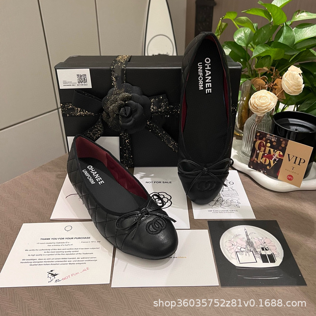 海外会員礼vipギフト新百合本革蝶結び平底バレエ靴ファッション菱格革靴